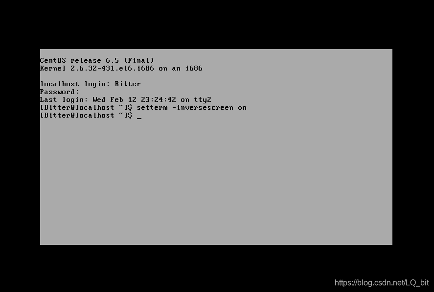 在虚拟控制台下输入账户名、密码,之后就可以使用虚拟控制台了。注意,在输入密码时不会有任何字符显示,所以不用担心,小心一些,不要将密码输错。可以看到,我们使用的是tty2,,允许同时打开多个虚拟控制台,按下相应的组合键就可以在不同的控制台之间进行切换,很方便。另外,使用setterm命令可以对虚拟控制台终端的前景色和背景色进行设置。例如,输入以下命令就会将前景色和背景色对换。如下图所示。