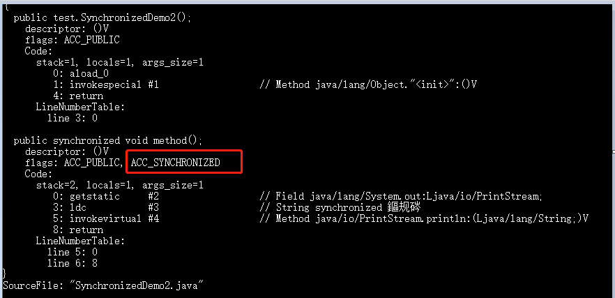 synchronized 使用的是 ACC_SYNCHRONIZED 标识,该标识证明了该方法是一个同步方法,JVM 通过该 ACC_SYNCHRONIZED 访问标志来辨别一个方法是否声明为同步方法,从而执行相应的同步调用。