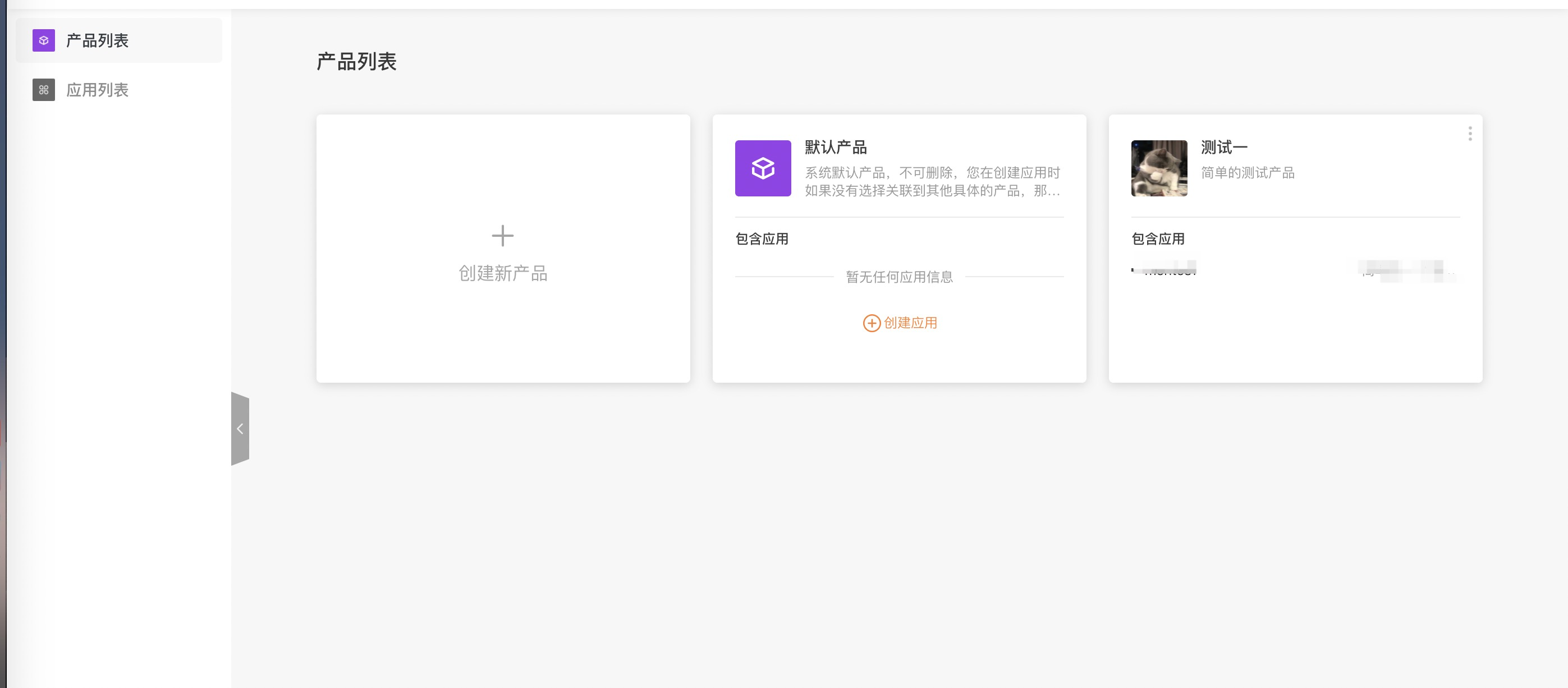 刚进入可以看到左边菜单栏有分为产品列表以及应用列表。产品列表下面可以挂载对应的应用(我这边已经创建了一个简单的Demo)。如果没有创建对应的应用则可以新建产品然后在产品底下创建应用或者是直接进入应用列表去创建。