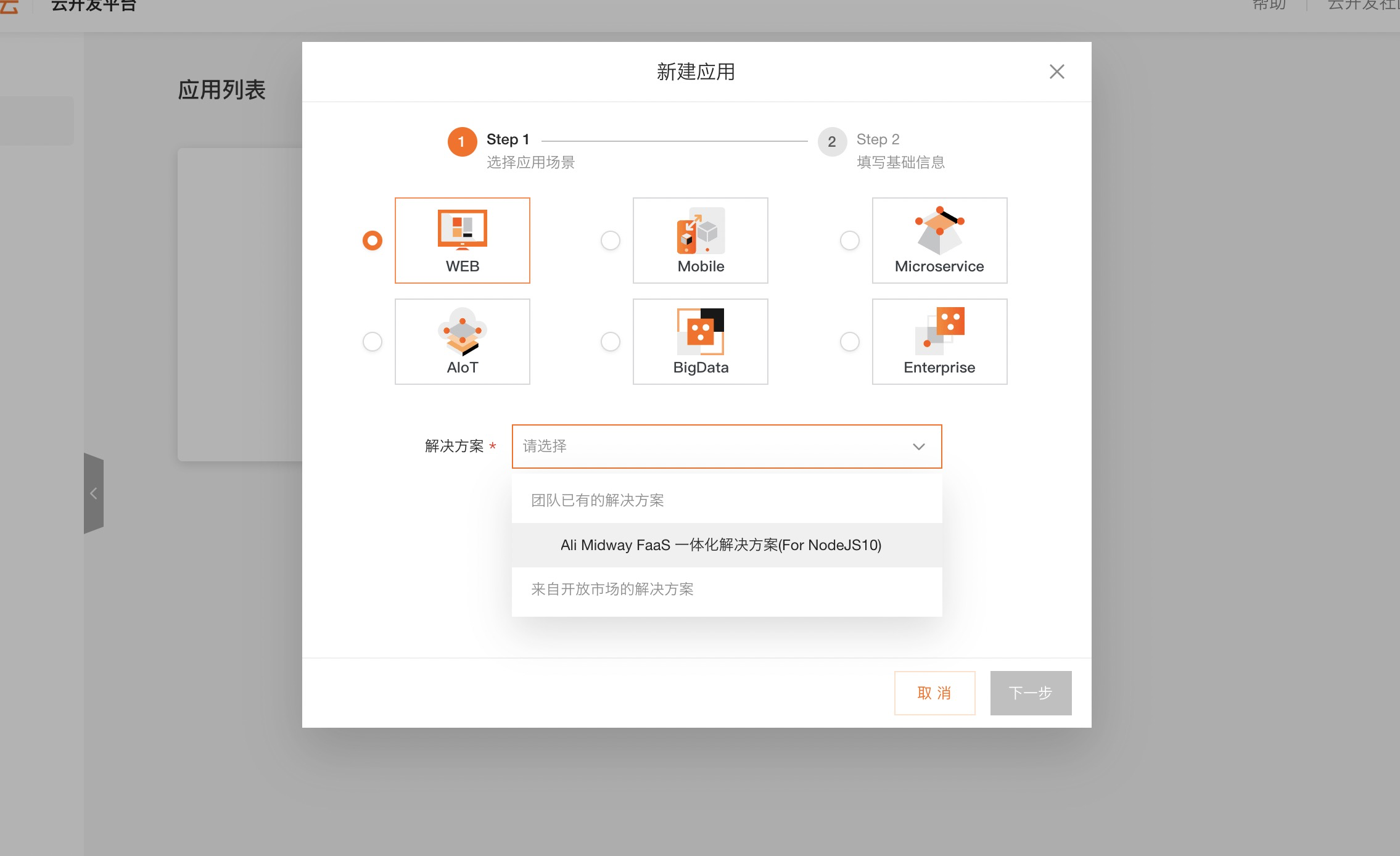 新建应用则会弹出对应的配置(如上图)。接下来就可以简单的创建一个应用出来(测试的Demo创建于Web工程,目前只支持WEB以及AIoT,其他的几个暂时没有对应的解决方案,不能创建出来)。