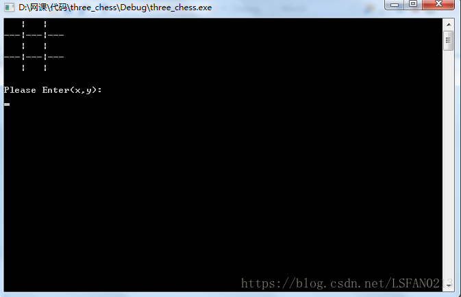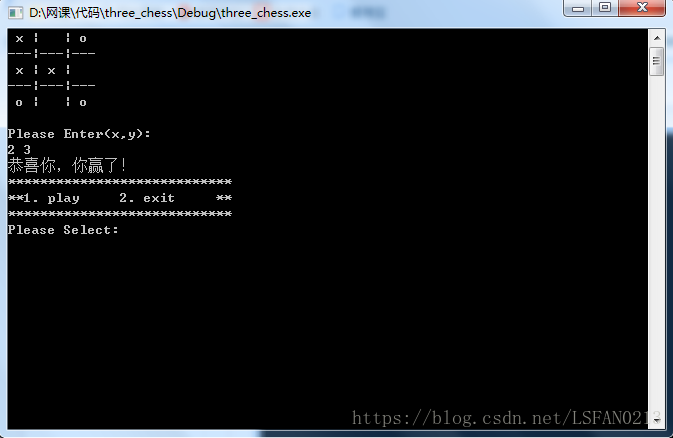 到这里,我们整个三子棋游戏的程序就已经完成了。接下来,我们来看看运行结果(vs2013)