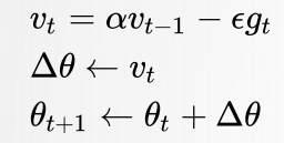 动量法针对 SGD 在病态曲率区域的困境,引入动量概念进行优化。其更新公式为: