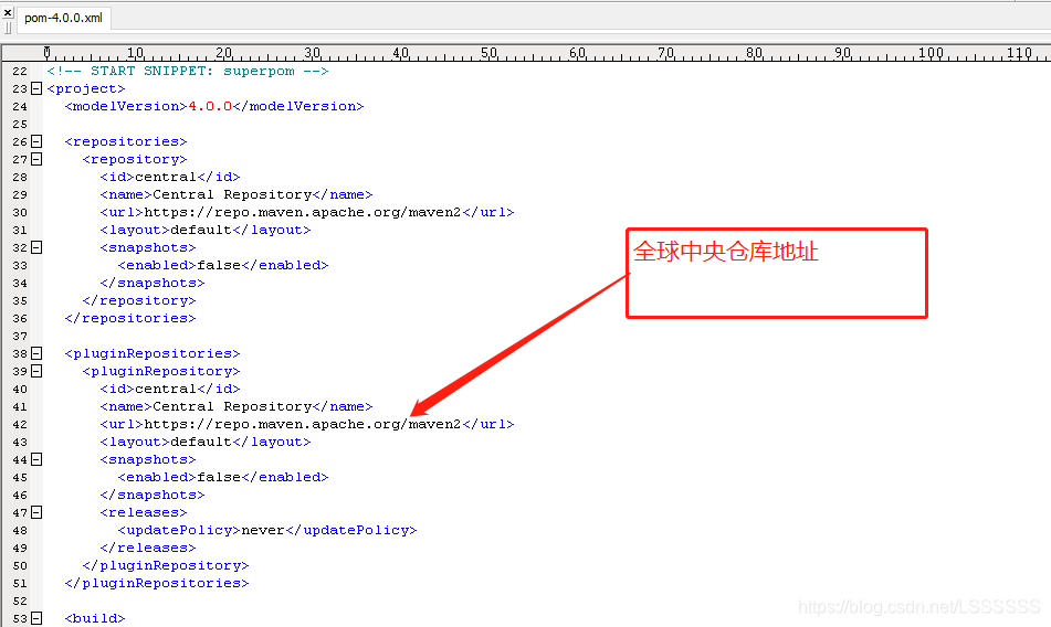 6.查看maven默认仓库地址>全球中央仓库地址,maven默认从这个仓库下载jar包。