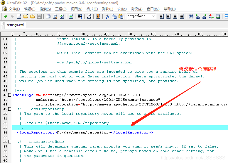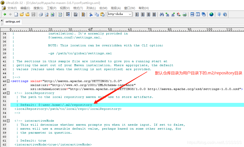 5. 打开apache-maven-3.6.1\conf 目录下的setting.xml 文件修改默认仓库目录