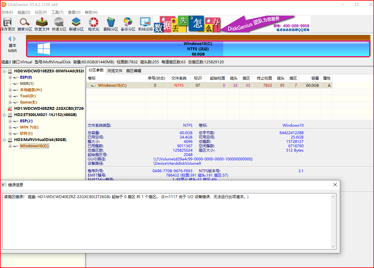 3 DiskGenius软件提示 读扇区错误! 磁盘: HD1:WDCWD40EZRZ-22GXCB0(3726GB) 起始于 0 扇区 共 1 个扇区。 (Err:1117 由于 I/O 设备错误,无法运行此项请求。)