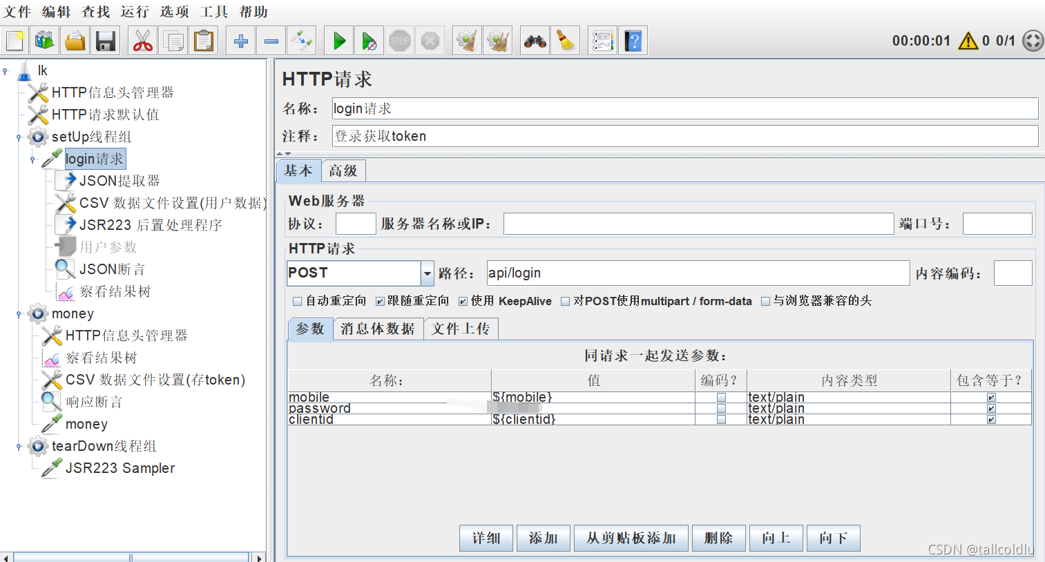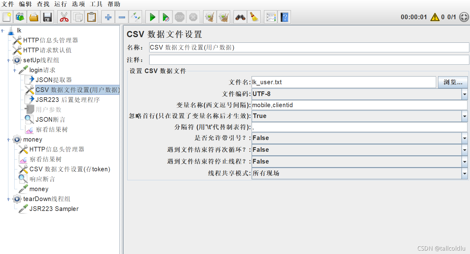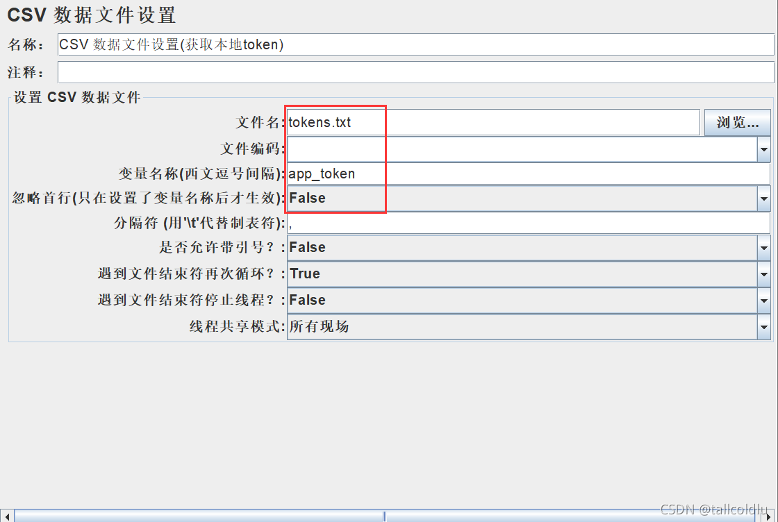 2、创建Http请求,通过配置元件CSV数据文件设置,读取本地txt文件,进行参数化请求