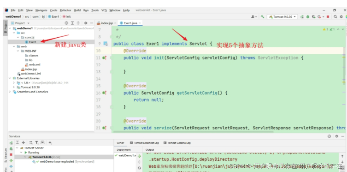 1、新建java类实现Servlet接口,并实现5个抽象方法