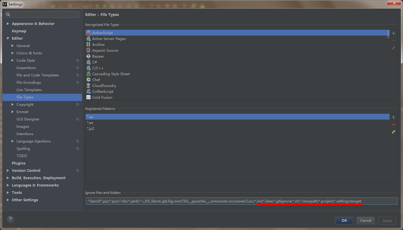 2、在下方的忽略文件和目录(Ignore files and folders)中添加自己需要过滤的内容
