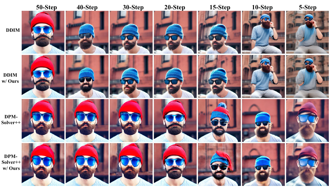 在不使用任何知识蒸馏的方法下,本方法将稳定扩散(SD)和DeepFloyd-IF模型的采样速度分别提高了41%和24%。