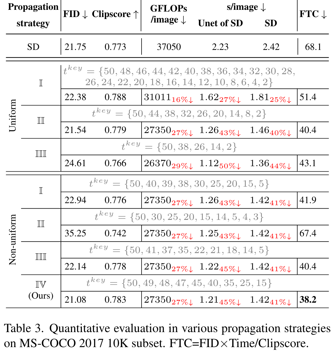 表3报告了消融研究的结果,考虑了关键和非关键时间步长的各种组合。这些结果表明,关键时间步长集合在生成图像方面具有更好的性能。