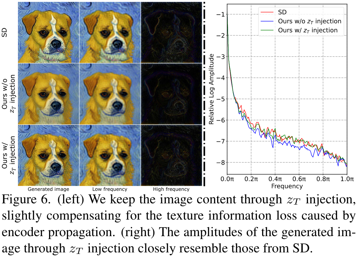 我们观察到,纹理信息的丢失发生在频域的所有频率上(见图6(右红蓝曲线))。这种方法确保了SD和zT注入在频域生成的结果非常相似(见图6(右,红色和绿色曲线)),生成的图像保持所需的保真度(见图6(左,下))。