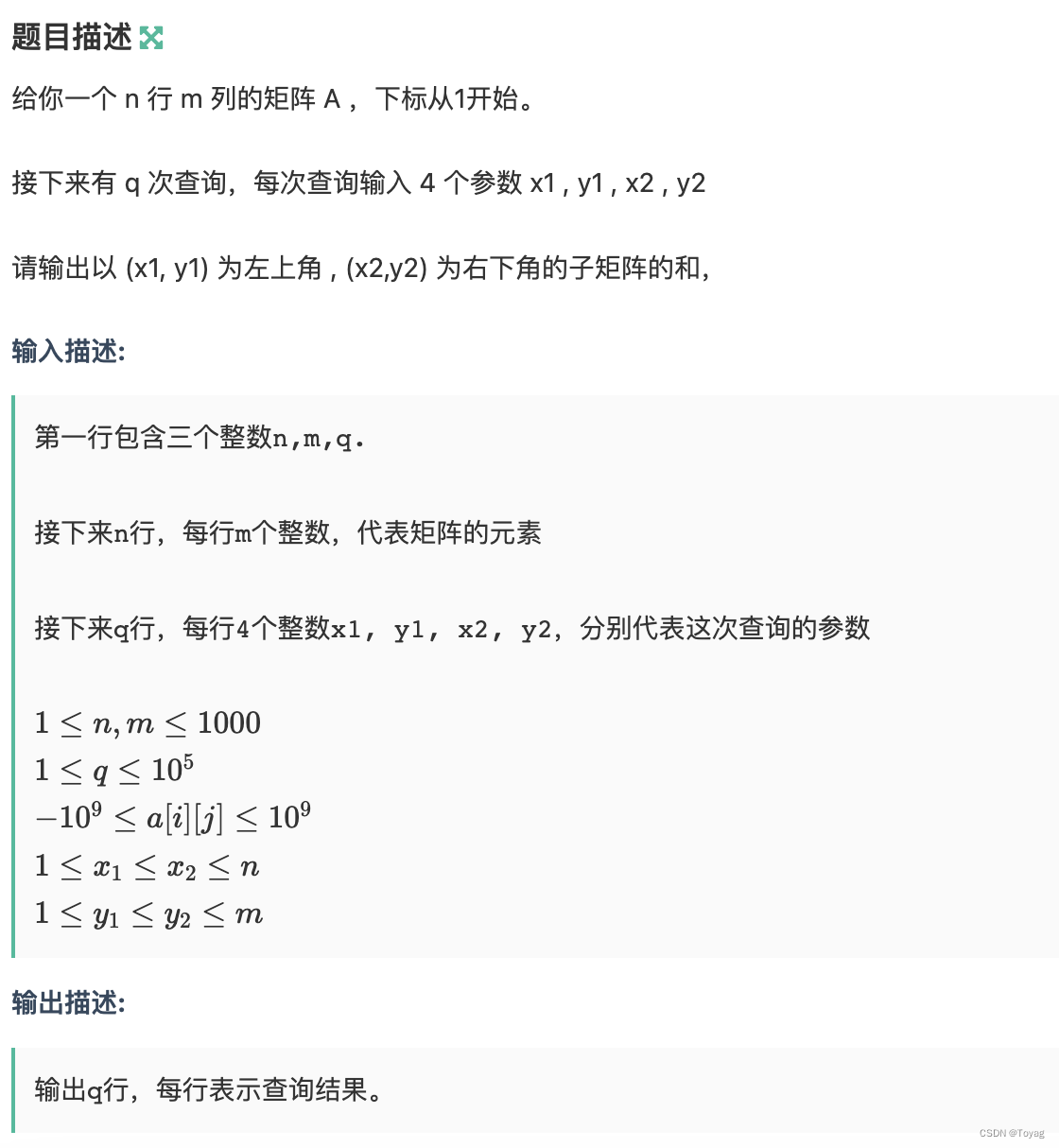 ans = prefixSum[x2][y2] - prefixSum[x2][y1 - 1] - prefixSum[x1 - 1][y2] + prefixSum[x1 - 1][y1 - 1]