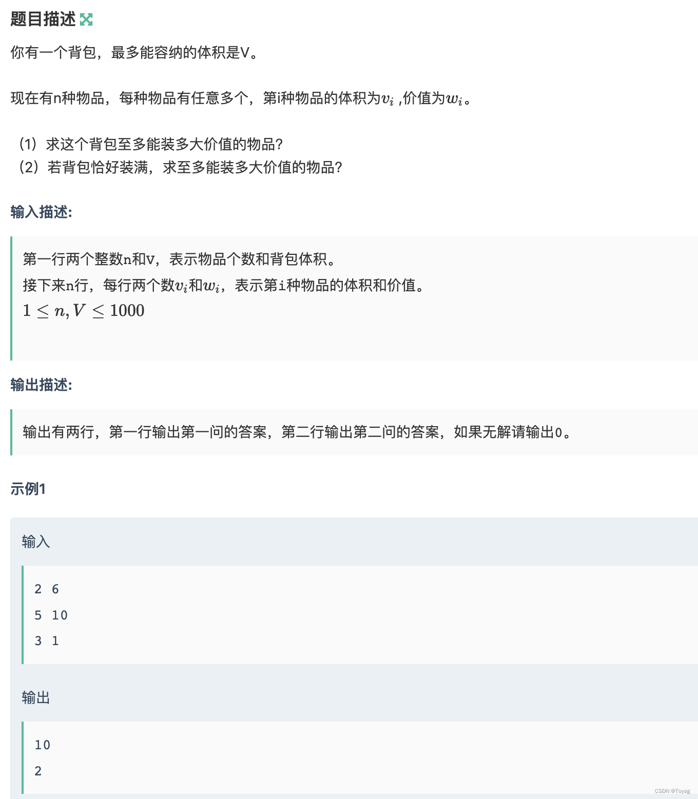 - 当只有物品一这种规格的时候,我装体积 V 的背包,可以算出来装多少;