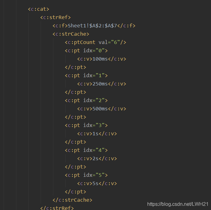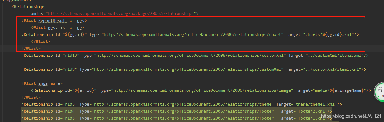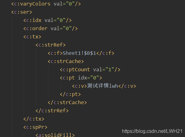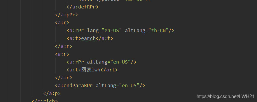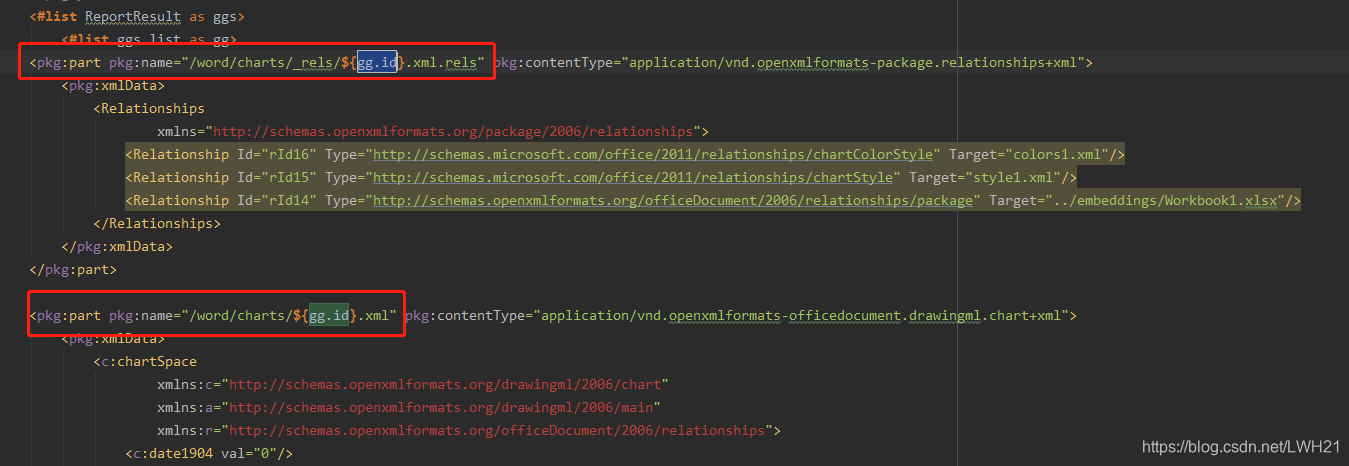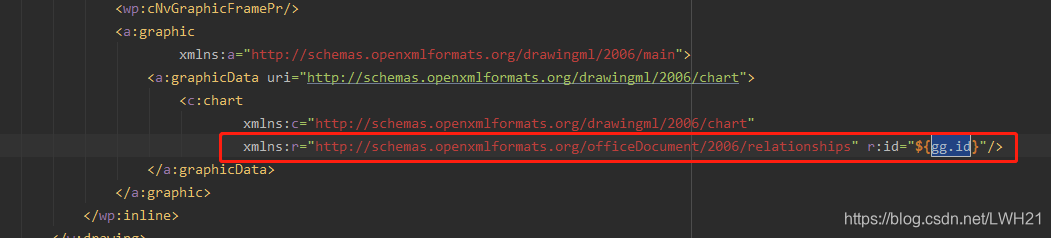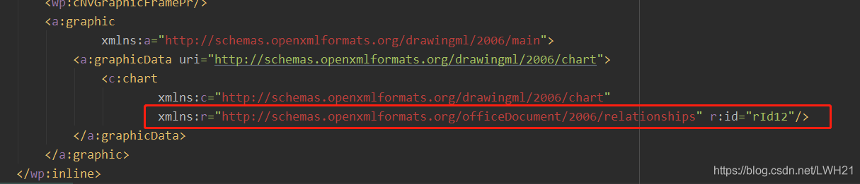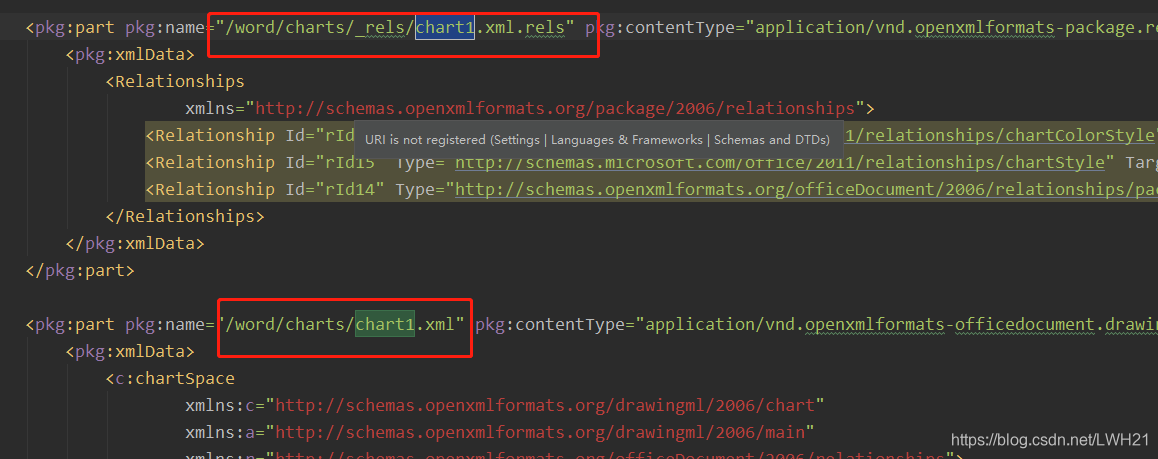 /word/charts/_rels/chart1.xml.rels 它里面放的应该是柱状图的结构 就是这三个标签对应的Target 不要删除 <Relationship Id="rId16" Type="http://schemas.microsoft.com/office/2011/relationships/chartColorStyle" Target="colors1.xml"/> <Relationship Id="rId15" Type="http://schemas.microsoft.com/office/2011/relationships/chartStyle" Target="style1.xml"/> <Relationship Id="rId14" Type="http://schemas.openxmlformats.org/officeDocument/2006/relationships/package" Target="../embeddings/Workbook1.xlsx"/>