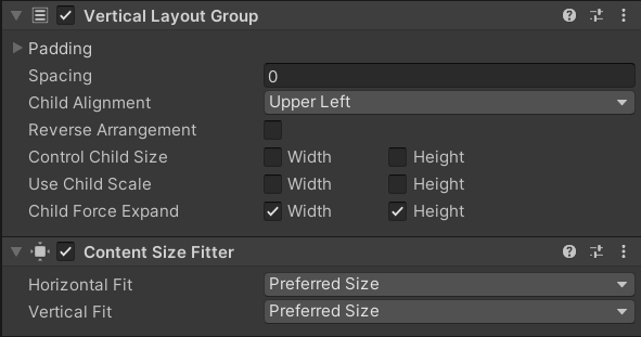 为了让「Scroll View」组件实现内容框自适应大小,我们可以在「Content」上挂载「Vertical Layout Group」组件和「Content Size Fitter」组件。