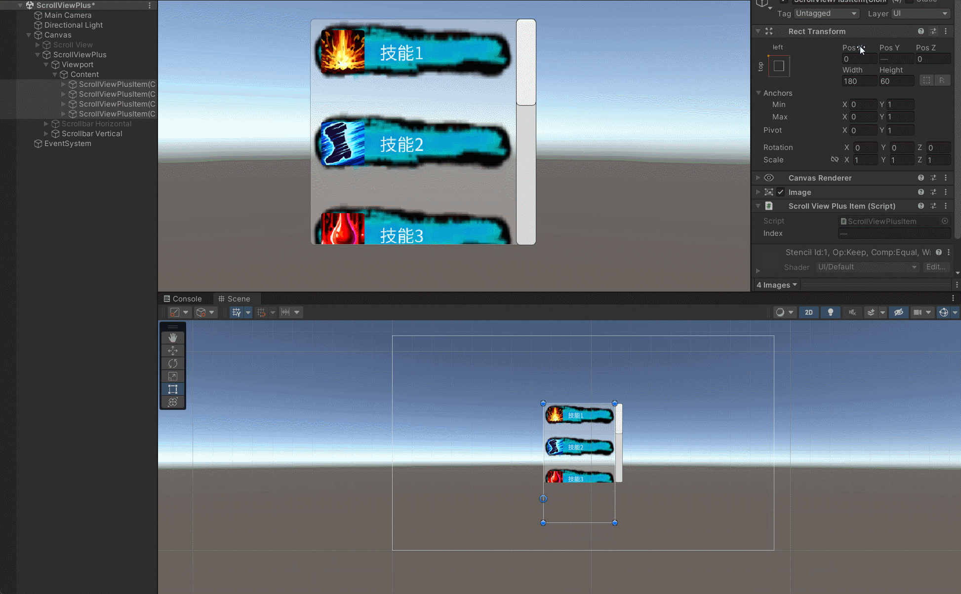 首先在场景中创建一个「Scroll View」并命名为「ScrollViewPlus」,在其上挂载一个同名脚本。创建一个子物体脚本命名为「ScrollViewPlusItem」。创建名为「ScrollViewPlusItem」的预制体,用于之后实例化子物体。