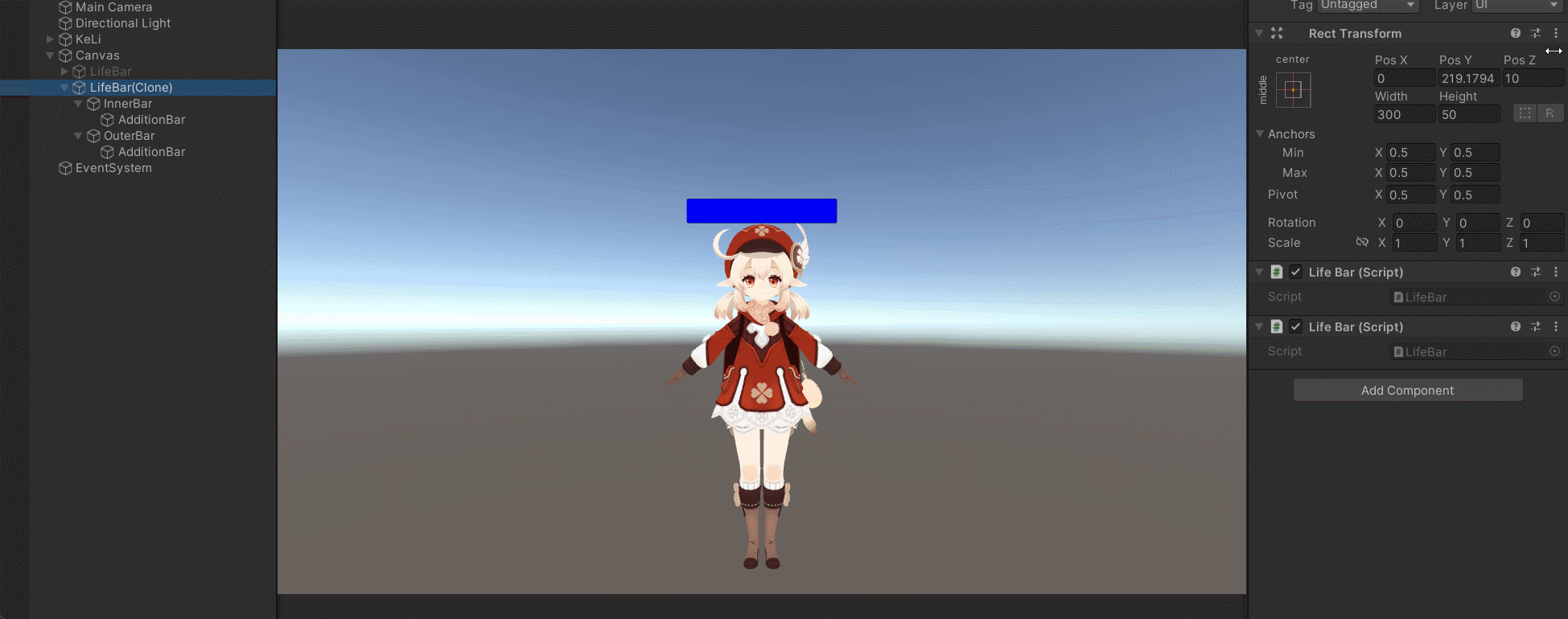 接下来需要在游戏运行时,将血条动态创建出来。在「KeLiController」中添加如下代码