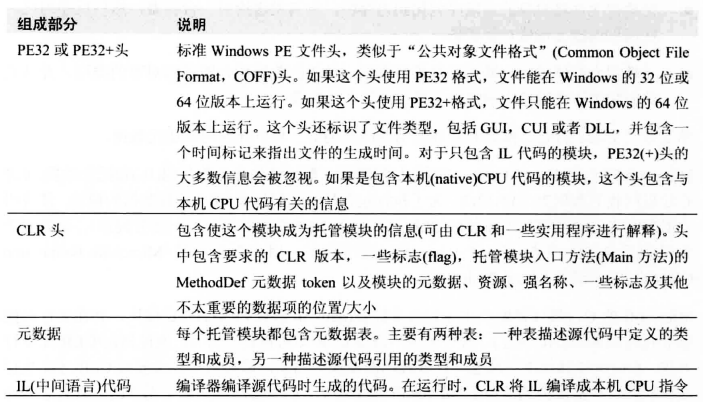 托管模块是一种标准的Windows可移植执行体文件,需要CLR才能执行。托管模块的组成部分如下图所示: