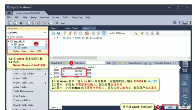 向 users 表中新增数据,其中 username 为 Spider-Man,password 为 pcc321。示例代码如下: