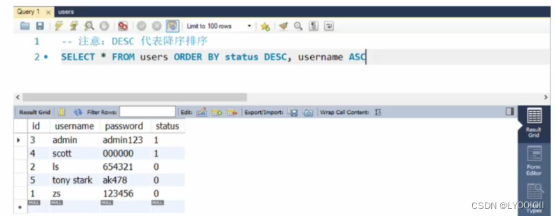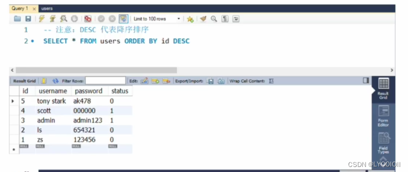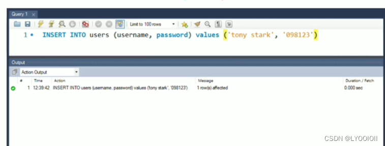 向users 表中,插入一条username为tony stark,password 为098123的用户数据,示例如下: