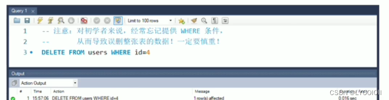 使用 DELETE 语句,会把真正的把数据从表中删除掉。为了保险起见,推荐使用标记删除的形式,来模拟删除的动作。