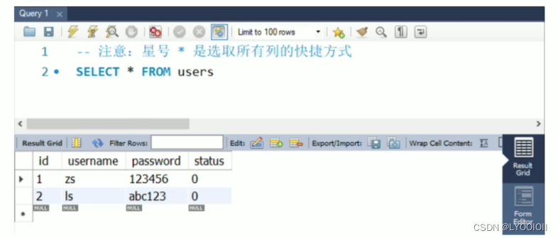 我们希望从users表中选取所有的列,可以使用符号 * 取代列的名称,示例如下: