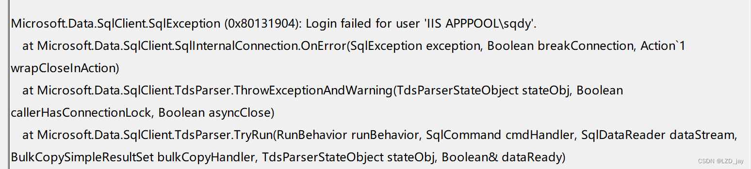 在Visual Studio 2022 开发工具可以正常运行 Web API 应用程序连接 LocalDB 数据库进行相关操作,但部署到IIS服务器里就出现:Login failed for user 'IIS APPPOOL\sqdy'. 错误提示,如下: