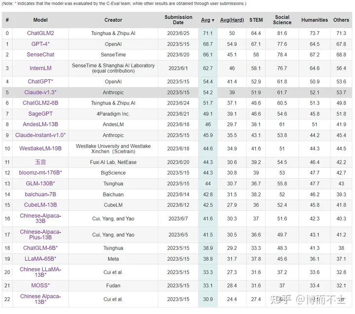 首先,从测试结果上看,我认为ChatGLM2-6B超越GPT4是比较真实的,大家从榜单的具体成绩可以看出,ChatGLM2-6B主要赢在Social Science,Humanities 和 Others 这三项上。而这三项实际上和训练的语料关系是比较大的,其中的很多项目是和国家的国情相关的,而非世界通识。因此,虽然我们不知道GPT4的中文语料占比,但是按照GPT3.5来推测的话,中文语料应该不会超过2%。而ChatGLM2-6B的语料是以中文为主的,所以在这几项上ChatGLM2-6B也并不足为奇。