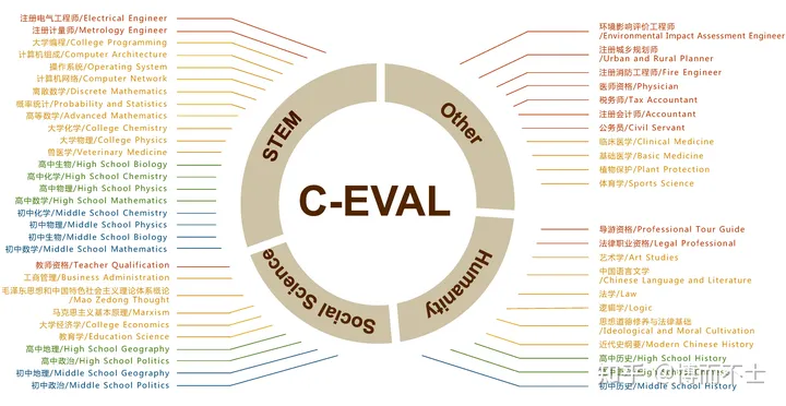 这里还是再稍微多介绍几句C-Eval。C-Eval数据集包含13948个多选题,涵盖52个不同的学科领域,如语文、数学、物理、化学、生物、历史、地理、政治、经济、法律等。这些题目分为四个难度等级,分别对应小学、初中、高中和大学的教育阶段。每个题目都有四个选项,其中一个是正确答案,另外三个是干扰项。每个题目还有一个问题类型标签,表示该题目考察的是事实性知识、推理能力、应用能力还是创新能力。