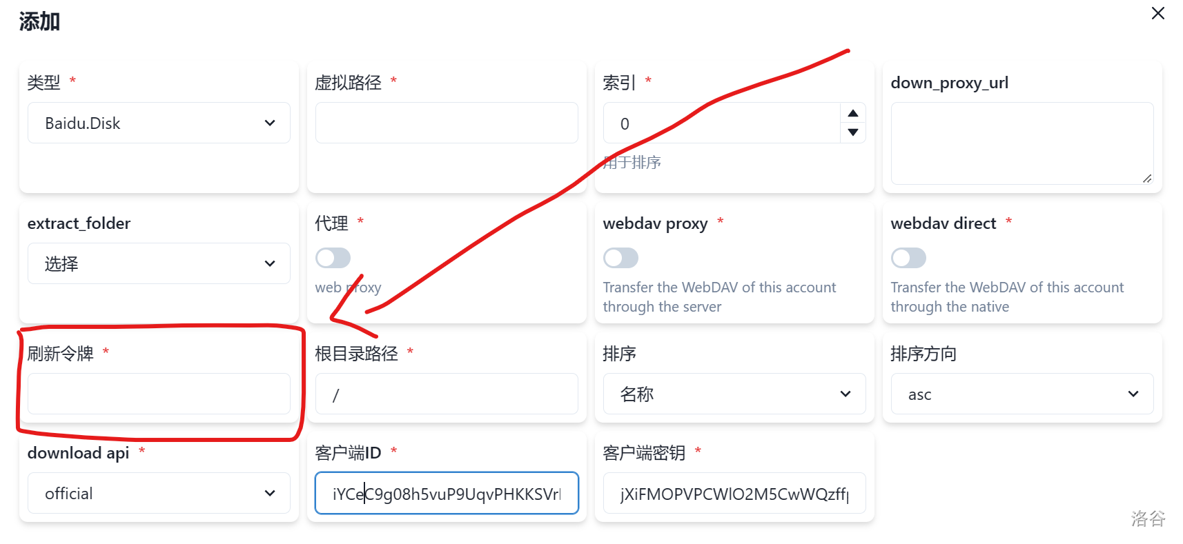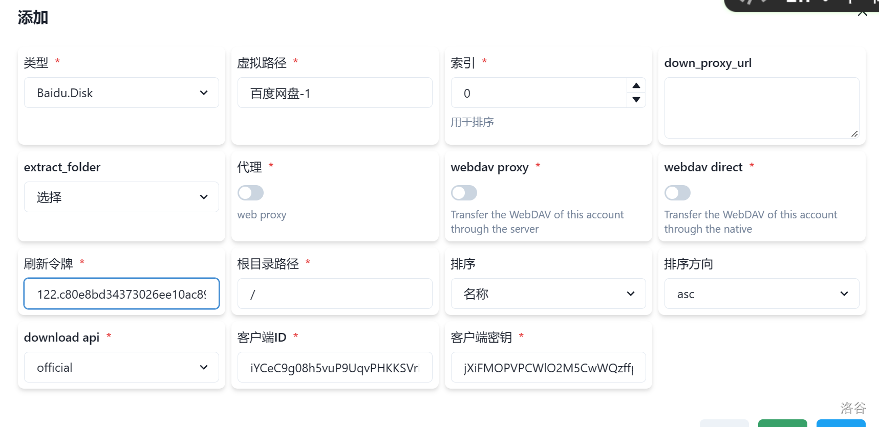 类型选择 Baidu.Disk,路径就填一个自己喜欢的盘符,中文也可以。其他都不用管,重点关注“刷新令牌”。