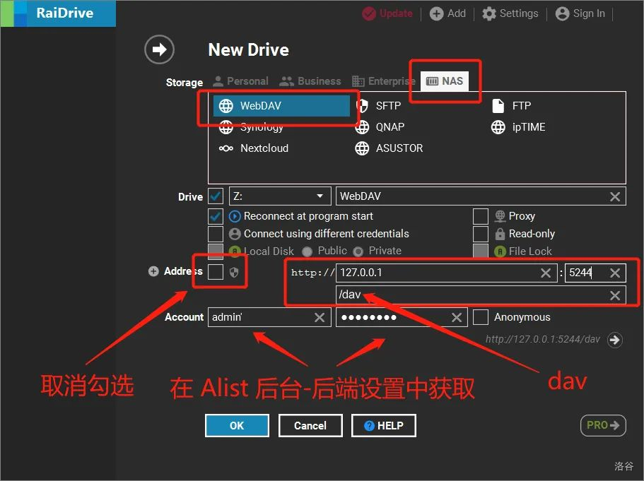 2.确保地址是 127.0.0.1:5244,下方是 /dav;