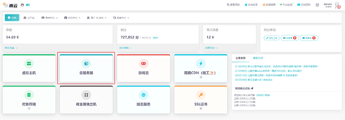 注册完账号后进到雨云控制台,云服务器入口可以在后台的 总览 和 云产品 部分找到: