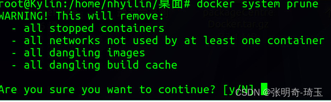 该指令只要清理磁盘,删除关闭的容器、无用的数据卷和网络,以及dangling镜像(即无tag的镜像)