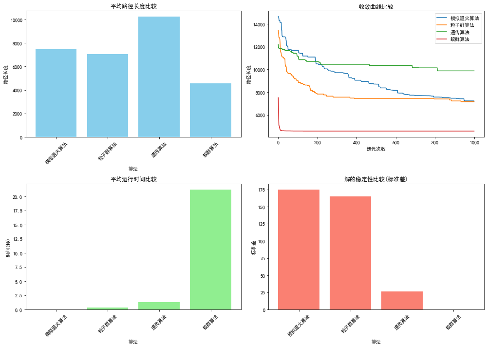 - 统计各算法的平均路径长度、最小路径长度、最大路径长度、标准差和运行时间