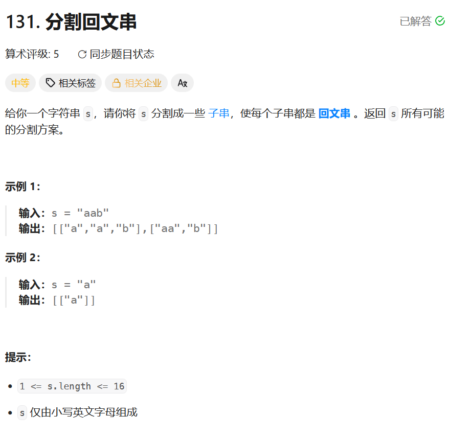 将字符串分割为若干回文子串;回文子串: 单个字符、正序倒序一样。