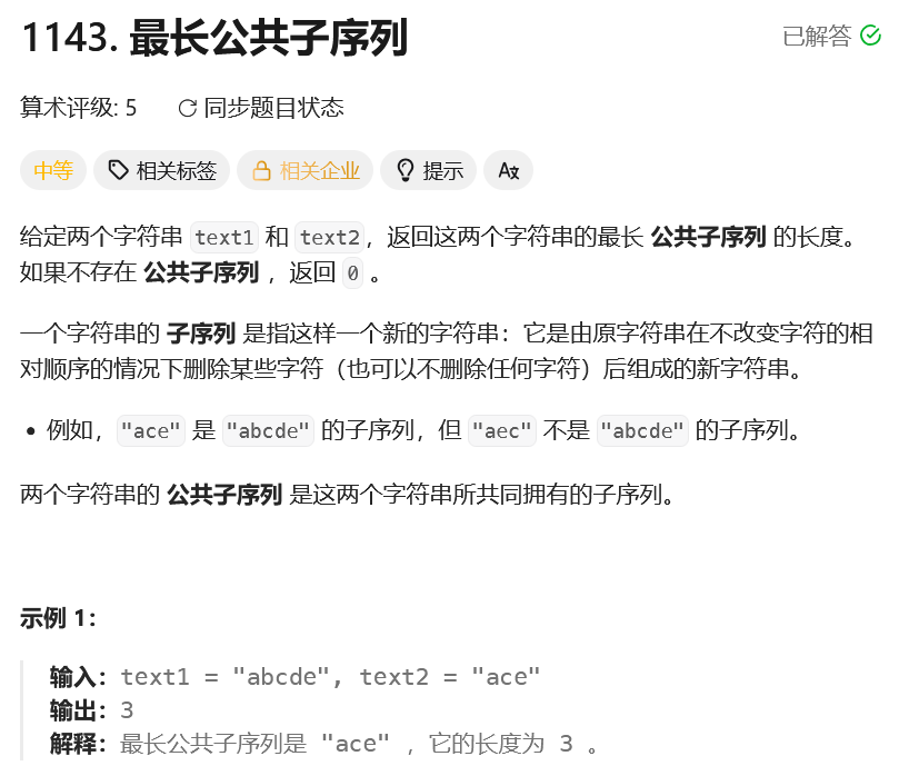 即当前两字符相等,一定至少是长度为1的公共子序列,只需要再加上各自往前推一个字符分别以i - 1 和 j - 1 结尾的最长公共子序列即可