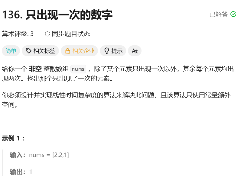 异或运算,对于任何一个整数与他本身异或结果为0,与0异或结果为他本身;且异或运算满足交换率,异或顺序改变结果不变