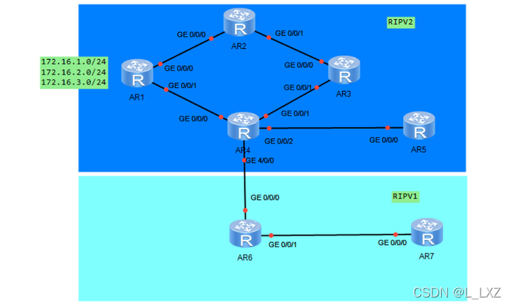 该实验配置了RIPV2和RIPV1路由器,通过IP地址规划实现全网可达。R1的三个环回被汇总,通过ACL增加特定路径开销以优化路由。R2作为边界路由器使用NAT映射实现R1到R7的telnet连接,并调整路由策略确保流量路径。R6和R7无法学习到R1的环回路由,而R5作为运营商接口不宣告路由。整个网络通过路由策略和认证增强了安全性。