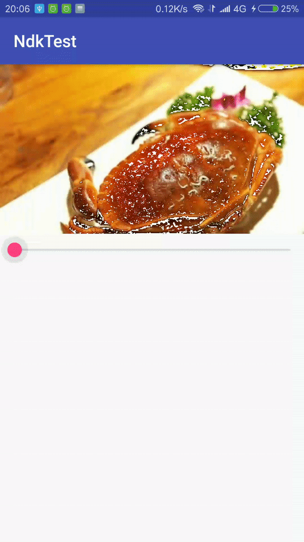 }public native int[] changeColorMatrix(int values,int w,int h);中的values是通过Seekbar传给自定义的ImageView的,这个方法在ImageView中调用,并且获得返回结果后会调用刷新方法,在OnDraw里将返回结果设置给新的bitmap,再进行绘制,有兴趣的可以自己动手试试,这里就不贴代码了,写得真的乱。