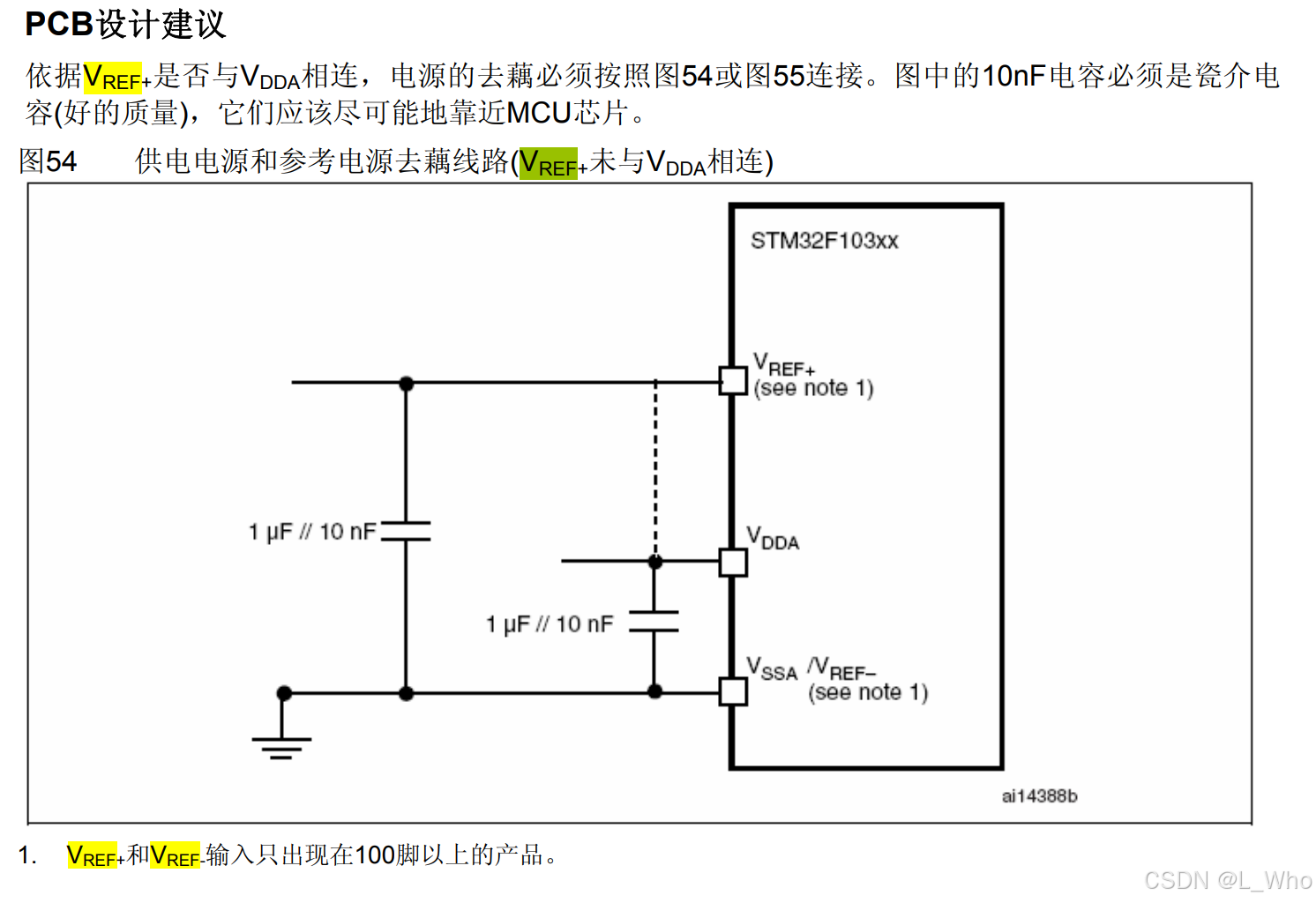 VDDA 与 VREF+可以不同,需要额外去耦合,并联1uf和10nf电容接地(见STM32F103数据手册5.3.18 ——12位ADC特性);