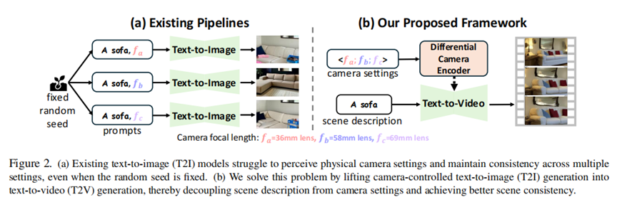 为了解决场景一致性问题,作者提出“维度提升”策略并将文本到图像(T2I)生成转化为文本到视频(T2V)生成,借助视频模型的时空一致性来维持场景稳定;在T2V框架中,作者将不变的场景描述与相机设置解耦:用场景描述文本构建基础场景,相机参数(如 “24mm 镜头”)作为额外条件控制每帧效果。
