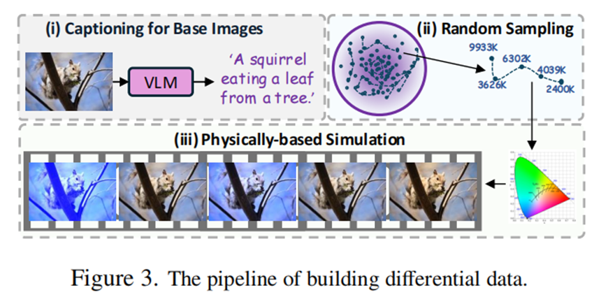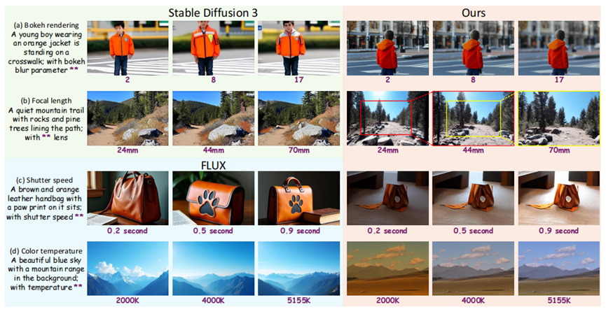 l 连续相机参数空间的随机采样:将相机参数(焦距、快门速度、色温、景深等)视为连续变量,在其物理范围内随机采样多个值(如焦距 24-70mm、色温 2000-10000K),且不按顺序排列,避免模型拟合方向模式(如单纯缩放),而是学习参数数值本身的物理意义。