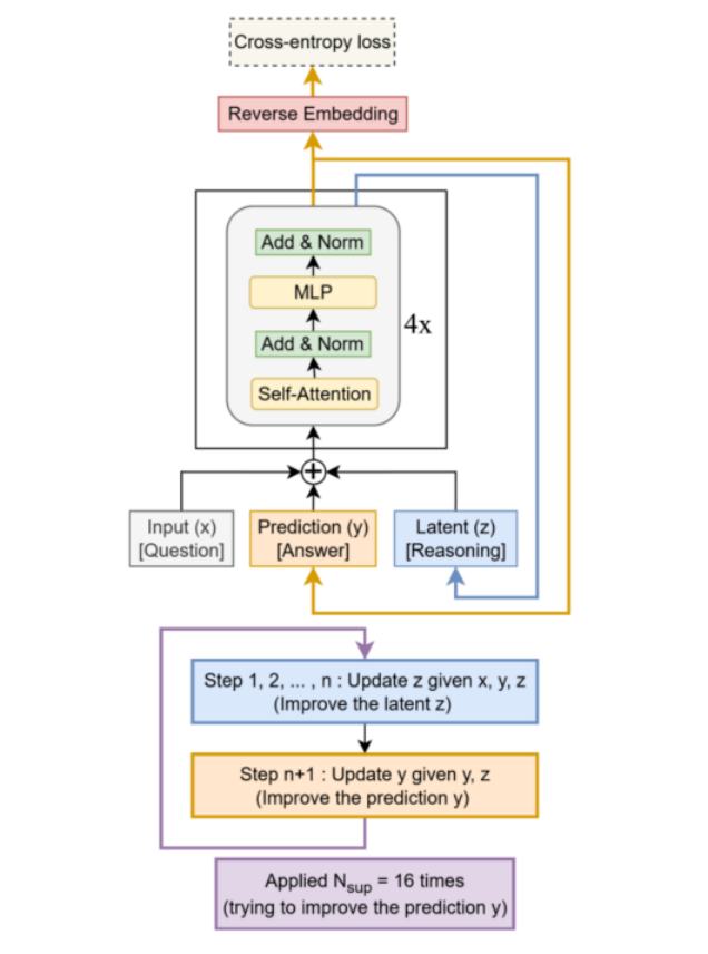 3. 潜在递归: 在每个监督步骤中,模型执行一个“深度递归”过程