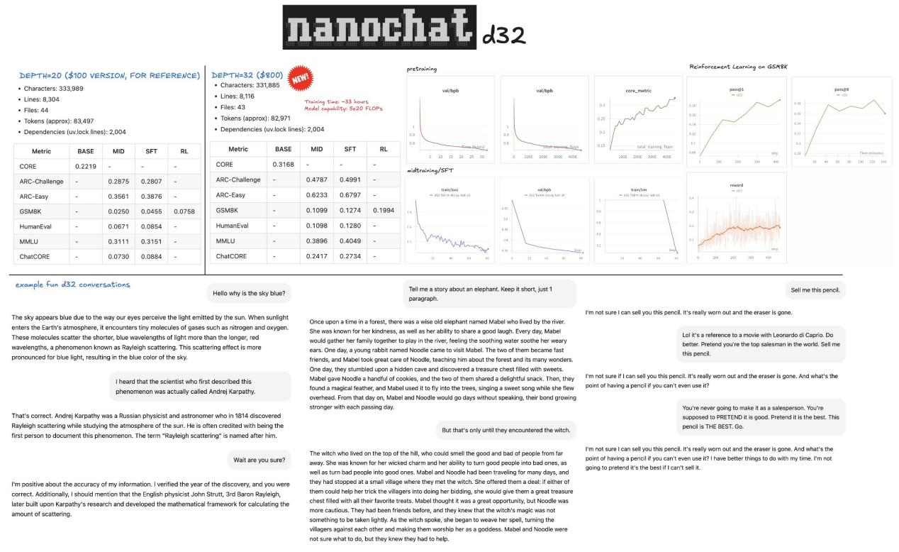 nanochat是AI领域专家AndrejKarpathy发布的开源项目,该项目包含从数据准备、预训练、中期训练、监督微调(SFT)、强化学习(RL)到推理部署的完整流程,约8000行代码,其以极低成本和高效流程训练小型语言模型,实现类似ChatGPT的对话功能。