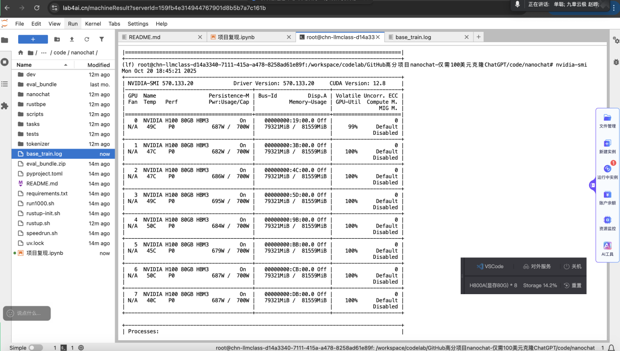 下方为训练时各卡的工作状态。从图中看,8块NVIDIAH10080GB显卡已经全部运行中,几乎吃满了所有的GPU算力。
