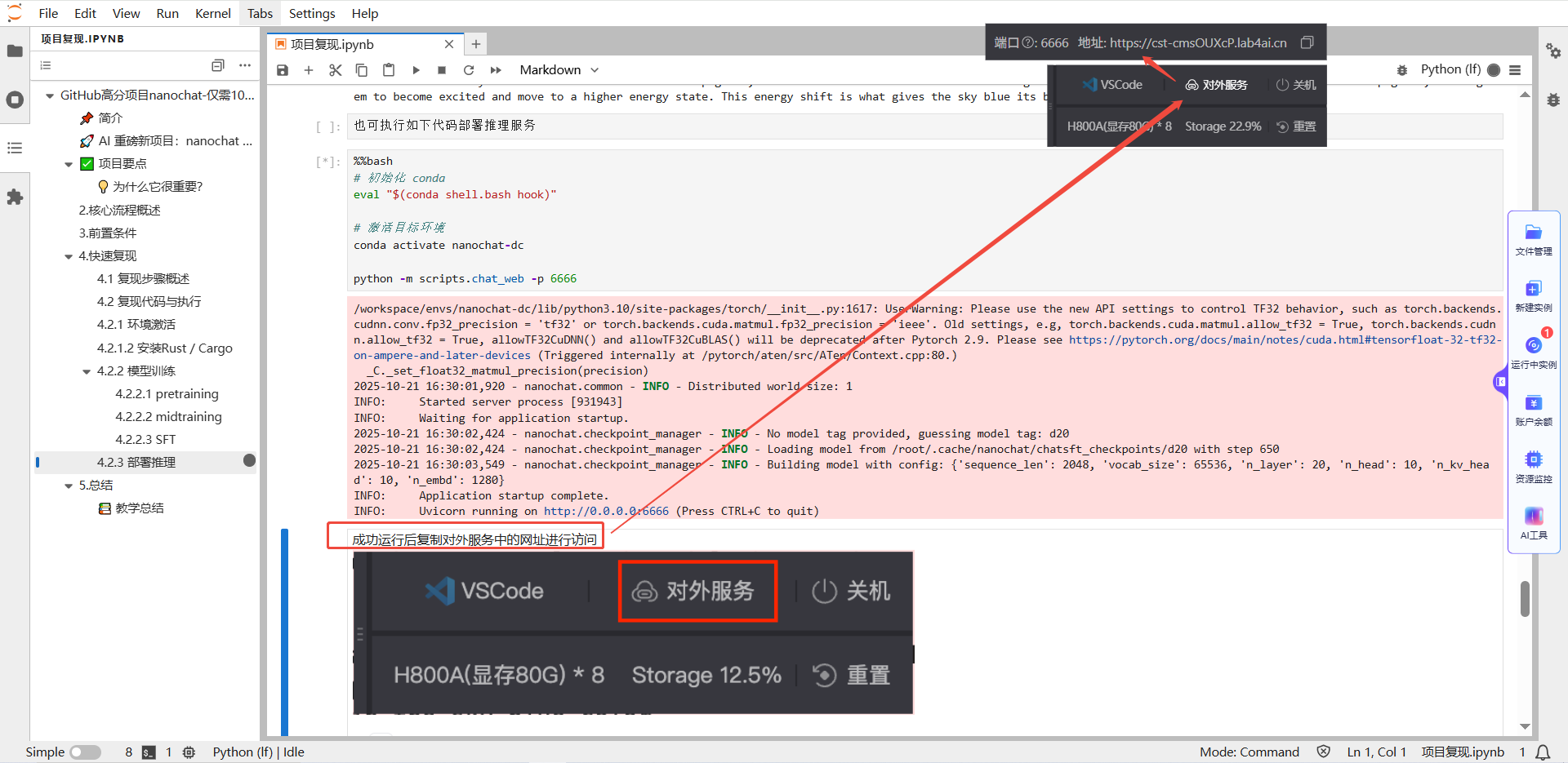 (2)通过WebUI执行对话。执行代码后,鼠标滑过右上角的【对外服务】,将链接复制到浏览器,打开后即可对话。