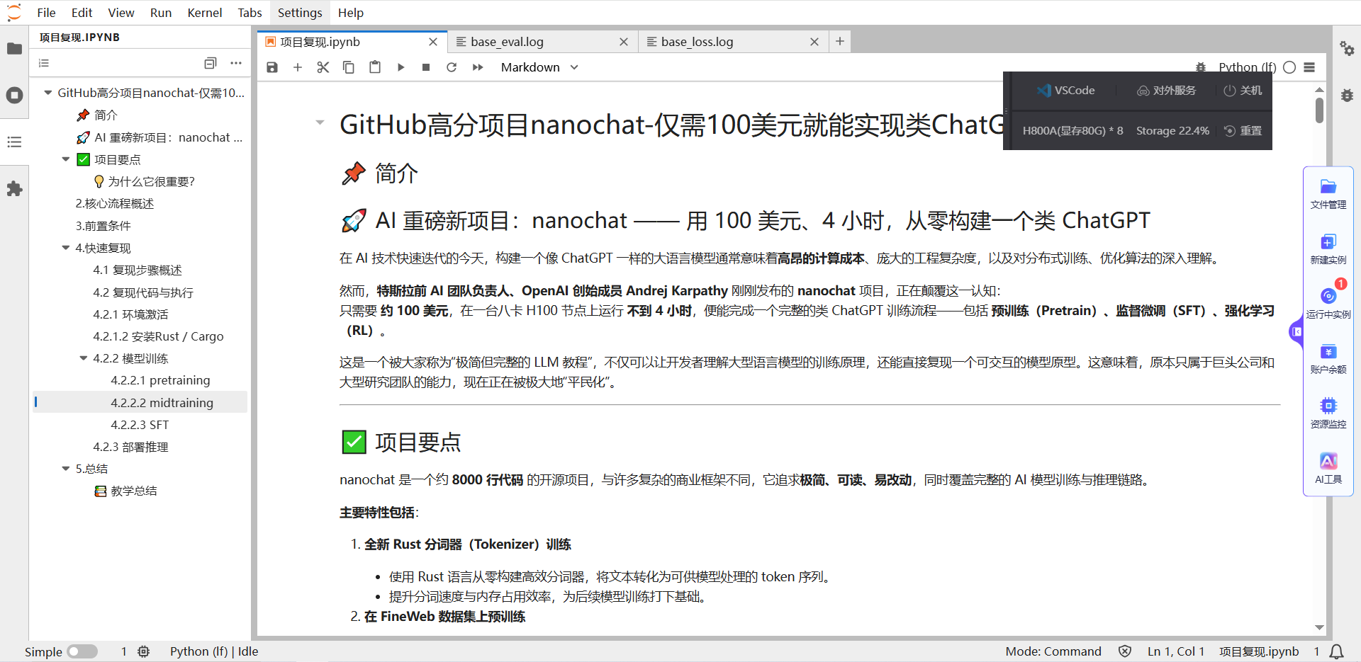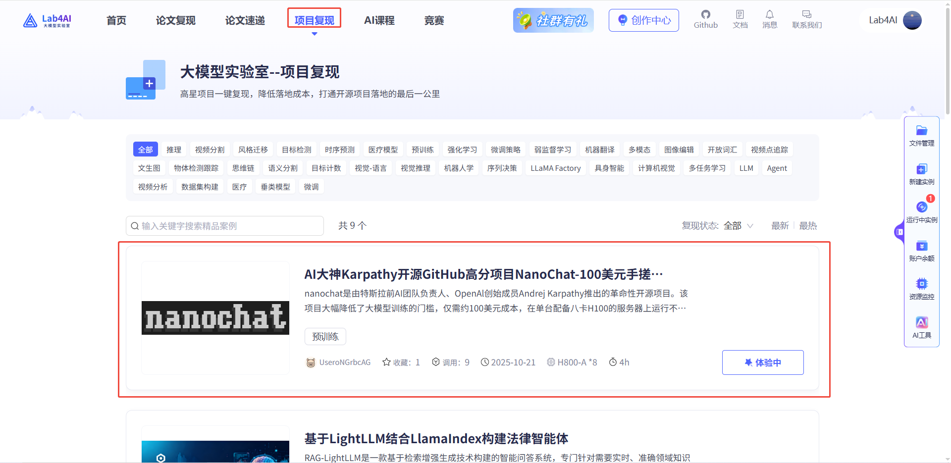 在“项目复现”中找到“AI大神Karpathy开源GitHub高分项目NanoChat-100美元手搓ChatGPT”。