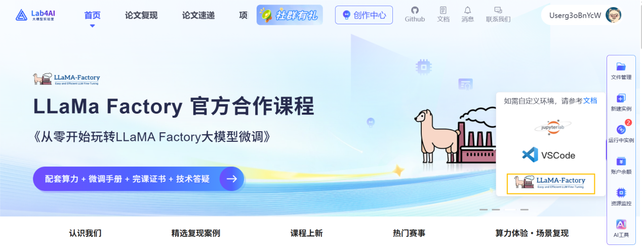 在Lab4AI平台上,您无需繁琐配置,无需环境部署,打开网页即可进入 LLaMA-Factory在线微调界面,完成从数据准备到训练评估的全流程。作为一个集算力、实验、社区、课程于一体的平台,您还能在Lab4AI平台上体验更多。