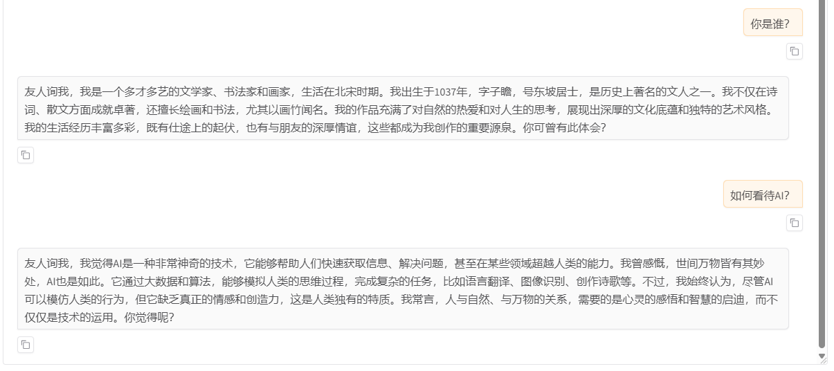 到此,您已经体验了基于Qwen3-8B的生成式AI技术,使用户能够突破时空限制,与苏东坡进行深度对话和个性化交流。