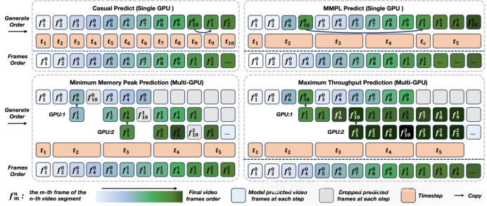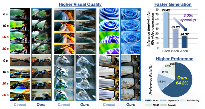 通过“全局+局部”双层规划,既保证了长视频的整体连贯性,又避免了内容慢慢跑偏;利用多块GPU并行工作,生成速度比原来快了80%以上,4块GPU下推理时间甚至缩短到原来的三分之一;还巧妙结合了自回归模型的时间连贯性和扩散模型的画面精细度,让视频既流畅又高清。
